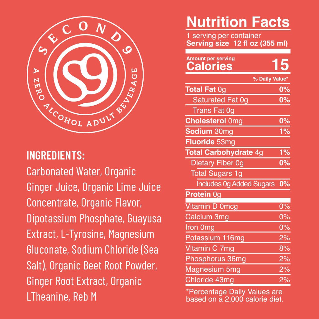 Carbonated Water, Organic Ginger Juice, Organic Lime Juice Concentrate, Organic Flavor, Dipotassium Phosphate, Guayusa Extract, L-Tyrosine, Magnesium Gluconate, Sodium Chloride (Sea Salt), Organic Beet Root Powder, Ginger Root Extract, Organic LTheanine, Reb M